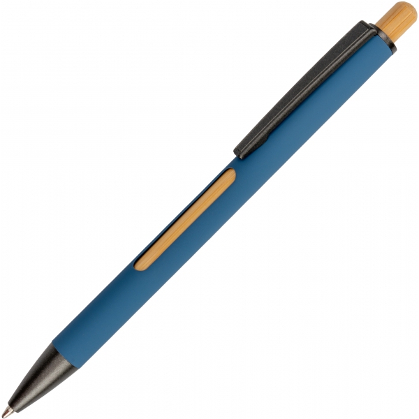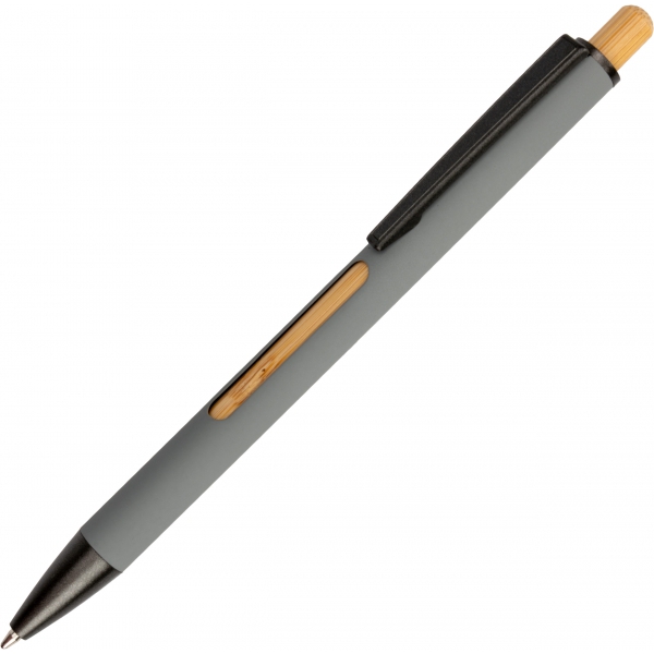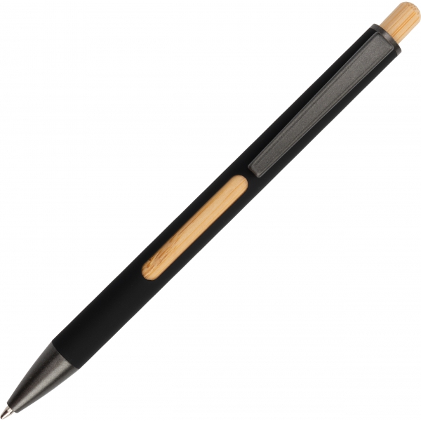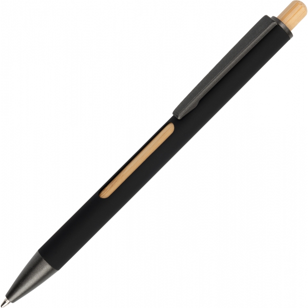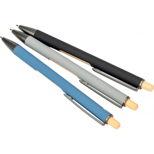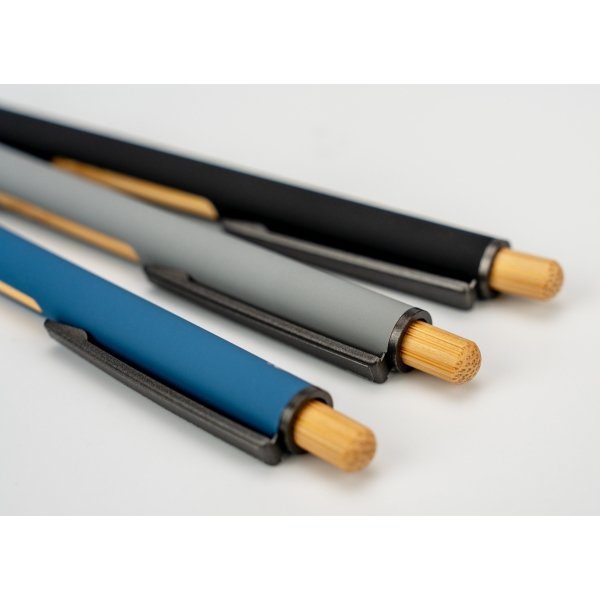Taaskasutatud alumiinumist pastakas millel bambusest nupp