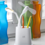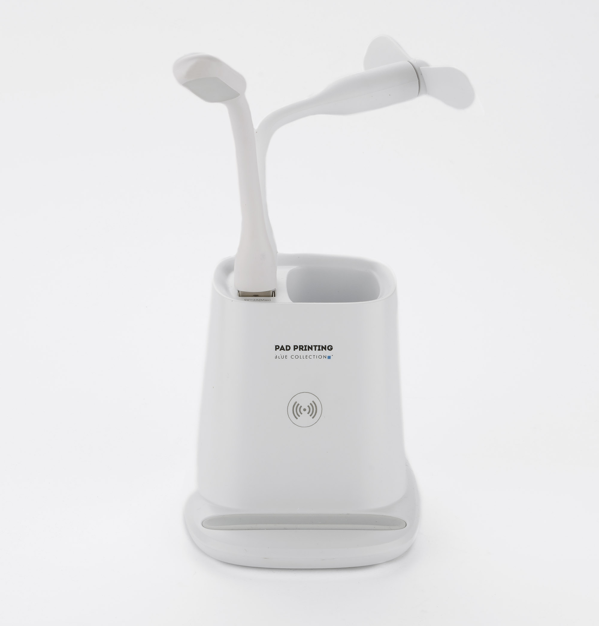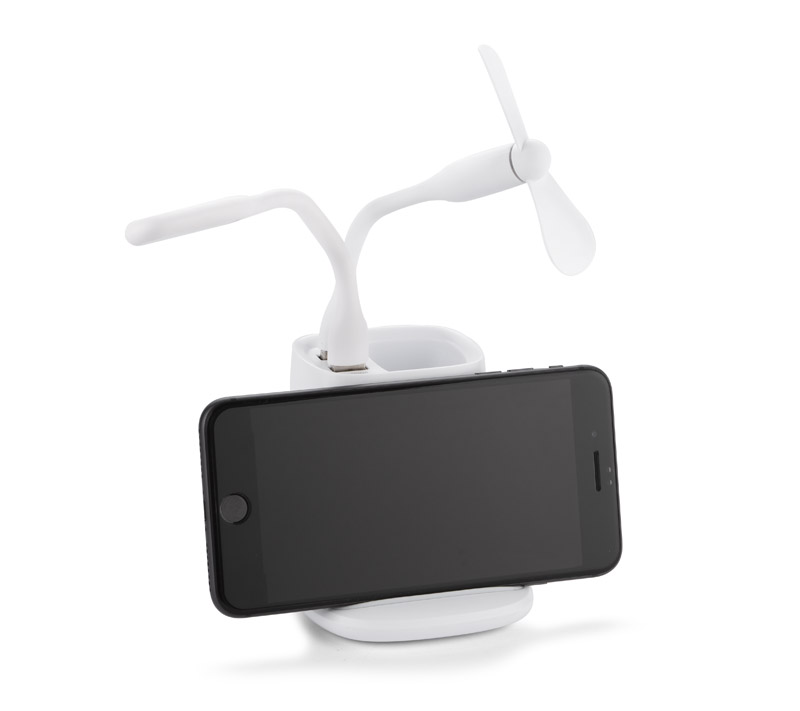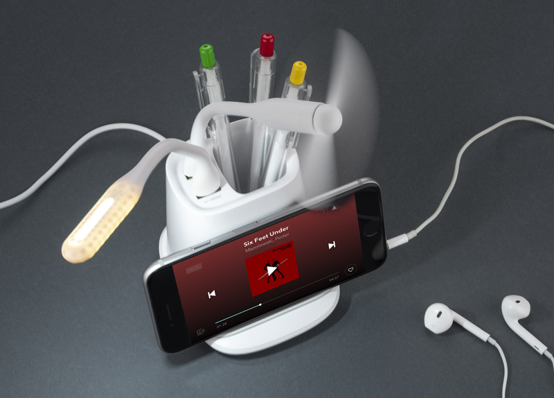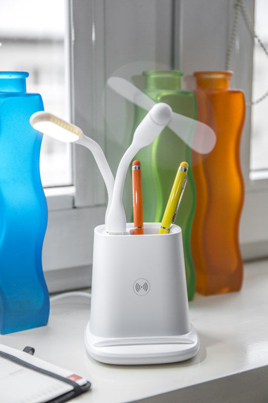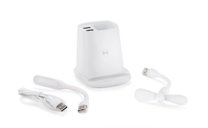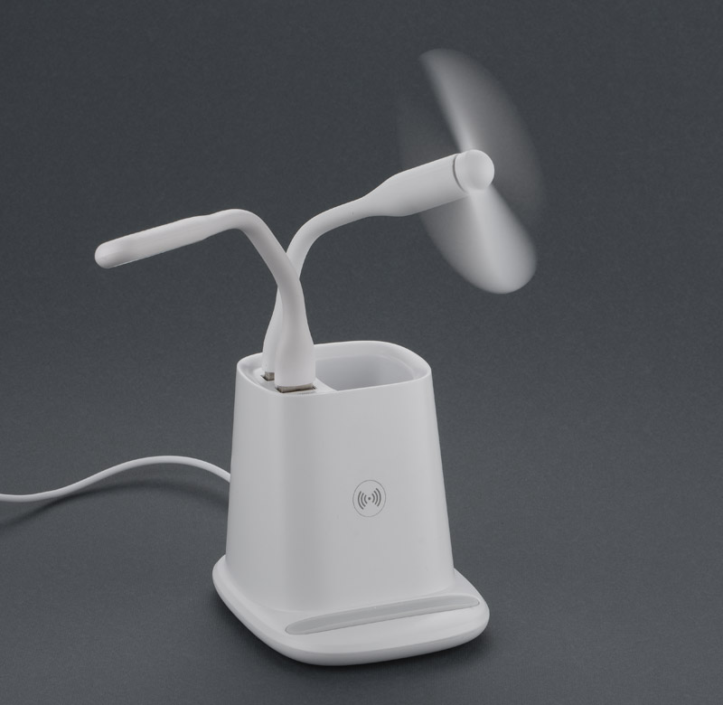 Wireless laadija, koos pliiatsitoposi, ventilaatori ja lambiga.